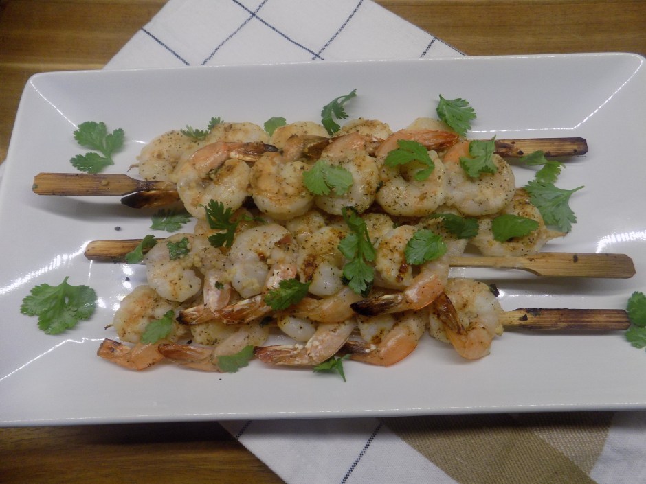 - Remove skewers from water and dry completely. Place shrimp on skewers.