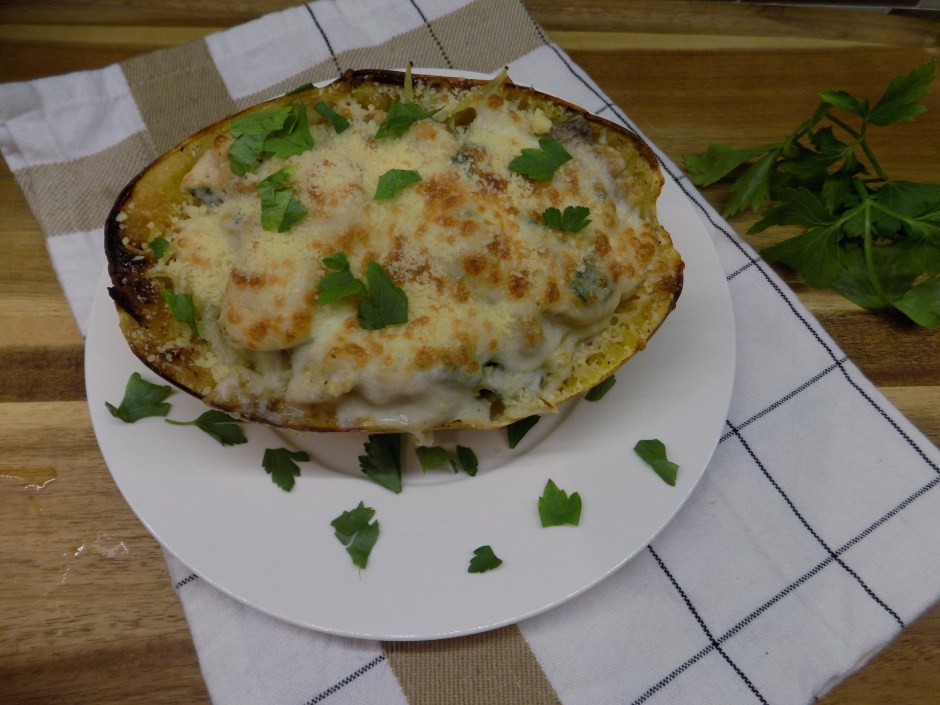 Chicken Alfredo Stuffed Spaghetti Squash with Mushrooms and Kale